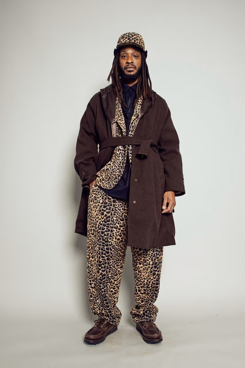 La palette chromatique repose majoritairement sur des tons bruns et neutres, servant de base à un jeu de contrastes visuels particulièrement riche. Les textures et motifs s’entrechoquent : carreaux et plaids traditionnels, imprimé léopard, camouflage agrandi, velours côtelé et tricots mouchetés. Cette sobriété apparente est dynamisée par des touches de couleurs franches, notamment une polaire florale rouge et bleu marine, ainsi qu’un jaune primaire éclatant appliqué à certaines pièces d’outerwear et accessoires.