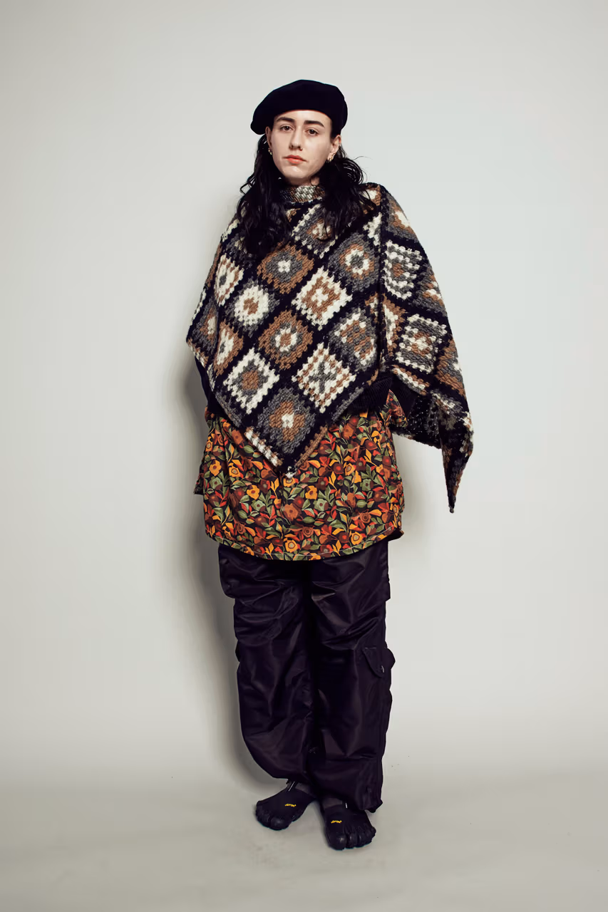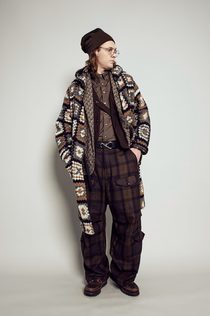 Malgré la diversité des influences, l’ensemble conserve une cohérence forte autour du thème de l’outdoor. Engineered Garments rappelle subtilement que, bien avant l’avènement des fibres synthétiques, le tweed et les lainages constituaient les premiers véritables “performance fabrics”. Dans cette collection FW26, ces matières historiques coexistent naturellement avec des nylons techniques résistants à l’eau, des polaires graphiques et des éléments crochetés aux couleurs vives.