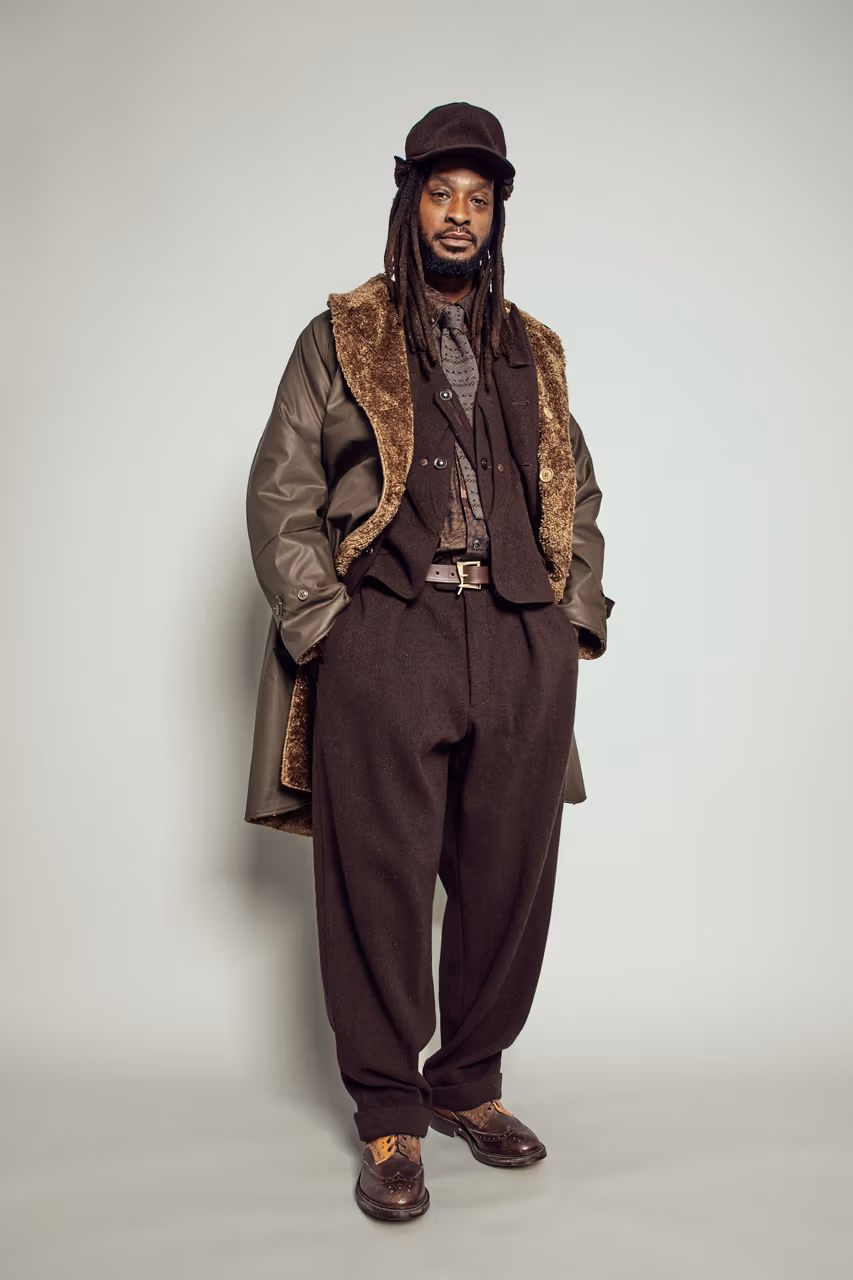 La collection se distingue par un dialogue permanent entre passé et présent. Des capes en tweed, des ensembles parfaitement coordonnés et des couches inspirées de l’univers militaire cohabitent avec des pièces plus contemporaines, comme le denim et le workwear. Certaines silhouettes semblent tout droit sorties d’une photographie ancienne, à l’image d’un costume Donegal gris porté intégralement cravate comprise et complété par une cape jetée sur l’épaule. Ailleurs, un pantalon en laine marron et une veste de chasse assortie sont associés à un manteau doublé de fourrure et à un haut chapeau en laine, évoquant une élégance rustique d’un autre temps.