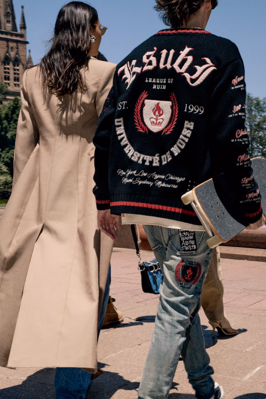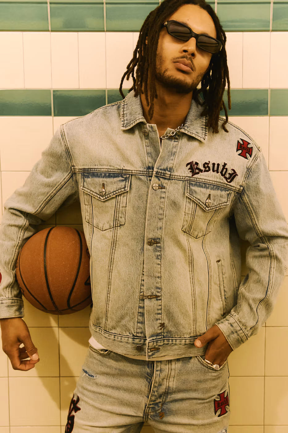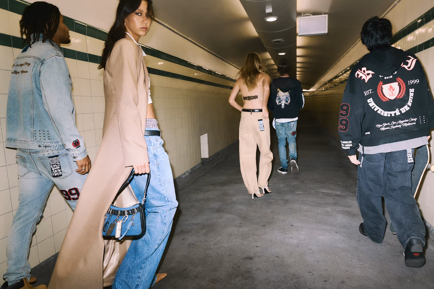 Les signatures visuelles de KSUBI cristaux, clous diamante et broderies gravées au laser ponctuent l’ensemble de la collection, apportant éclat et contraste à cette esthétique volontairement rugueuse.