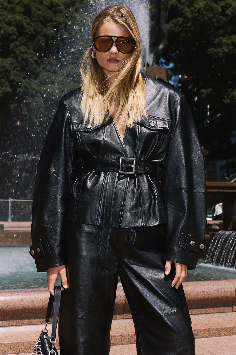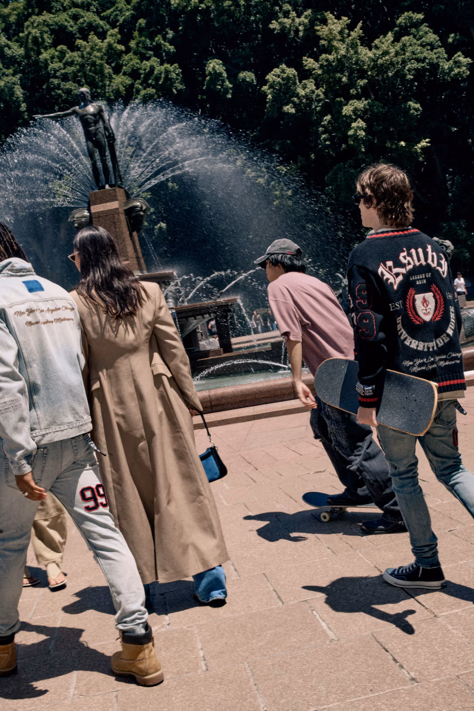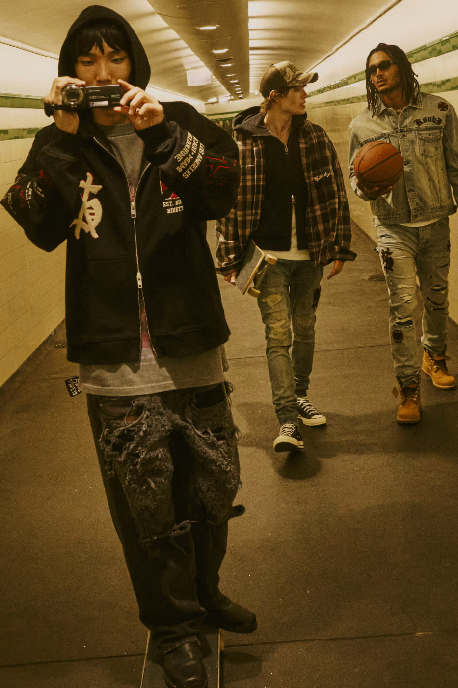 Les signatures visuelles de KSUBI cristaux, clous diamante et broderies gravées au laser ponctuent l’ensemble de la collection, apportant éclat et contraste à cette esthétique volontairement rugueuse.