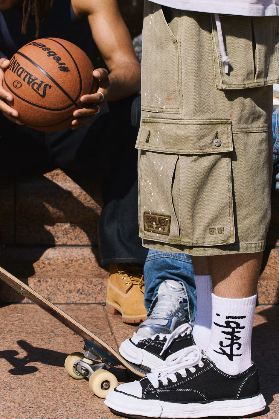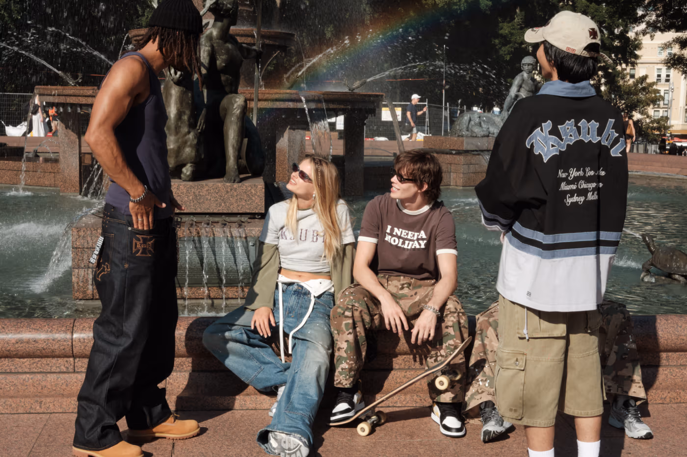 Côté homme, KSUBI met en avant des track sets revisités, incarnant l’approche « anti-sport » chère à la marque, ainsi que des maillots inspirés de la NFL au look vintage. Les cargos amples en camo délavé et en verts militaires, agrémentés d’éclaboussures de peinture et de détails utilitaires, s’imposent comme des pièces clés de la saison.