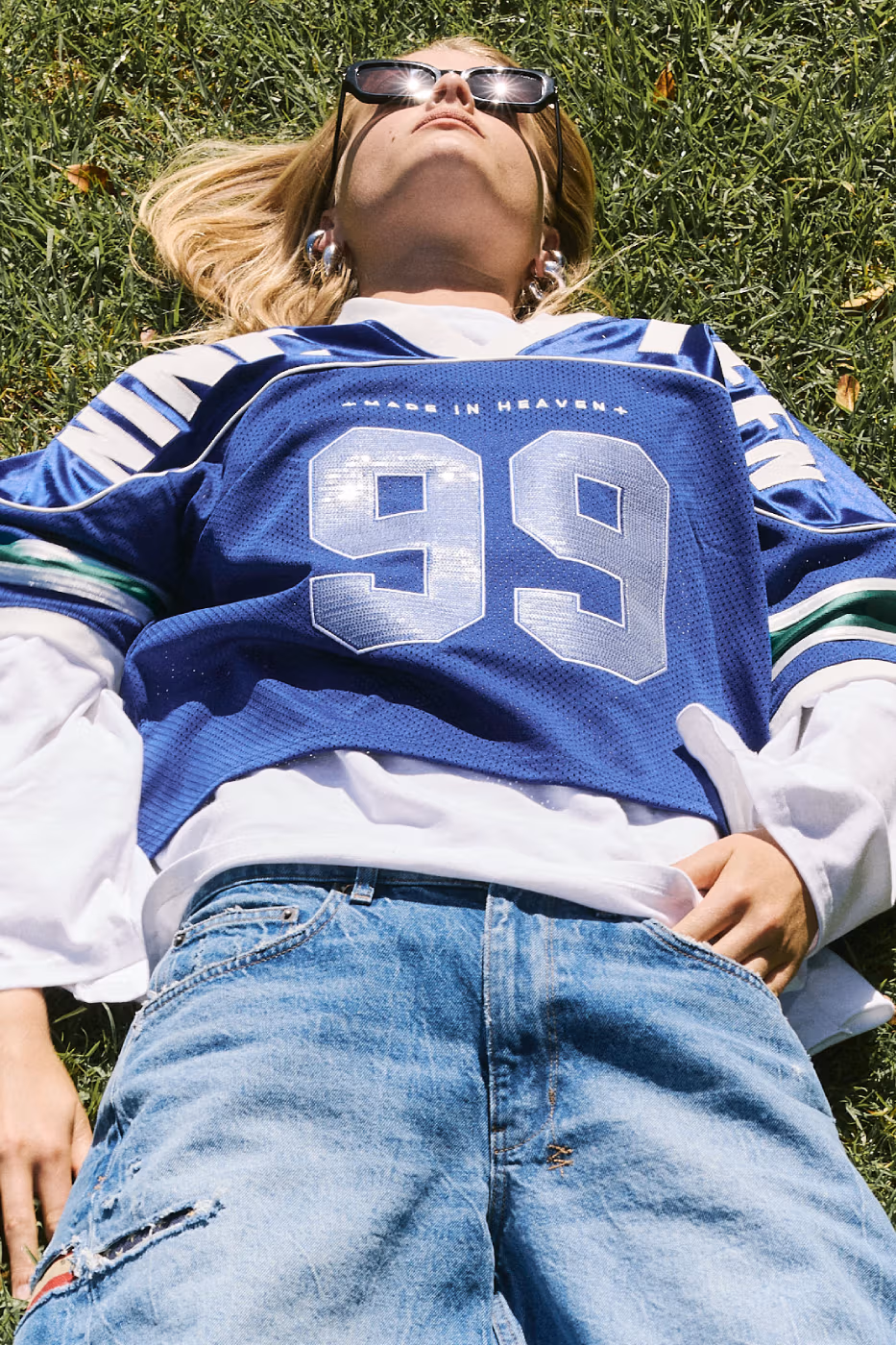 Pour la femme, la collection associe denim distressed, carreaux heritage et codes universitaires, le tout structuré par des épaules marquées et des coupes affirmées. Parmi les pièces phares figurent des jeans à sequins, des formes barrel en cuir, ainsi qu’un power suit chocolat rehaussé de bandes inspirées du sportswear.