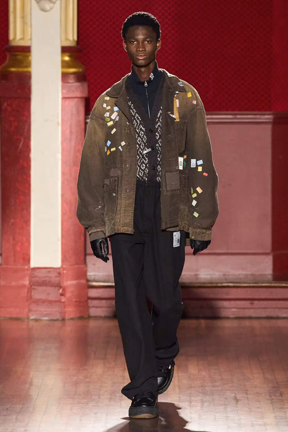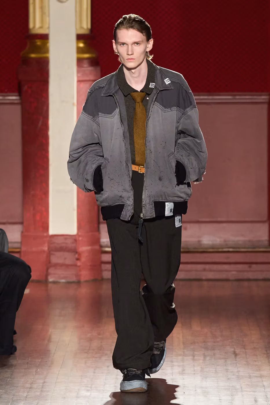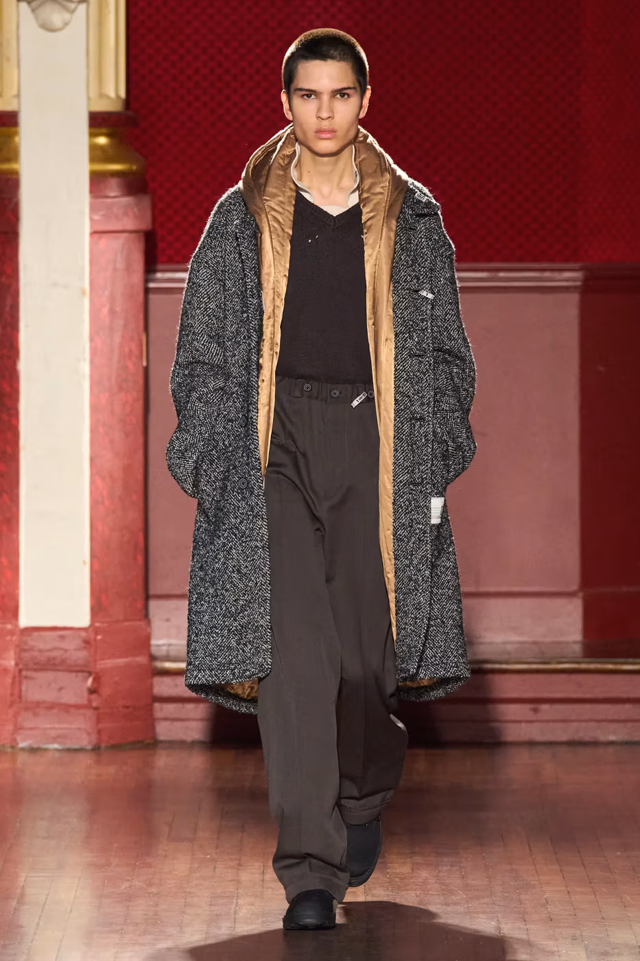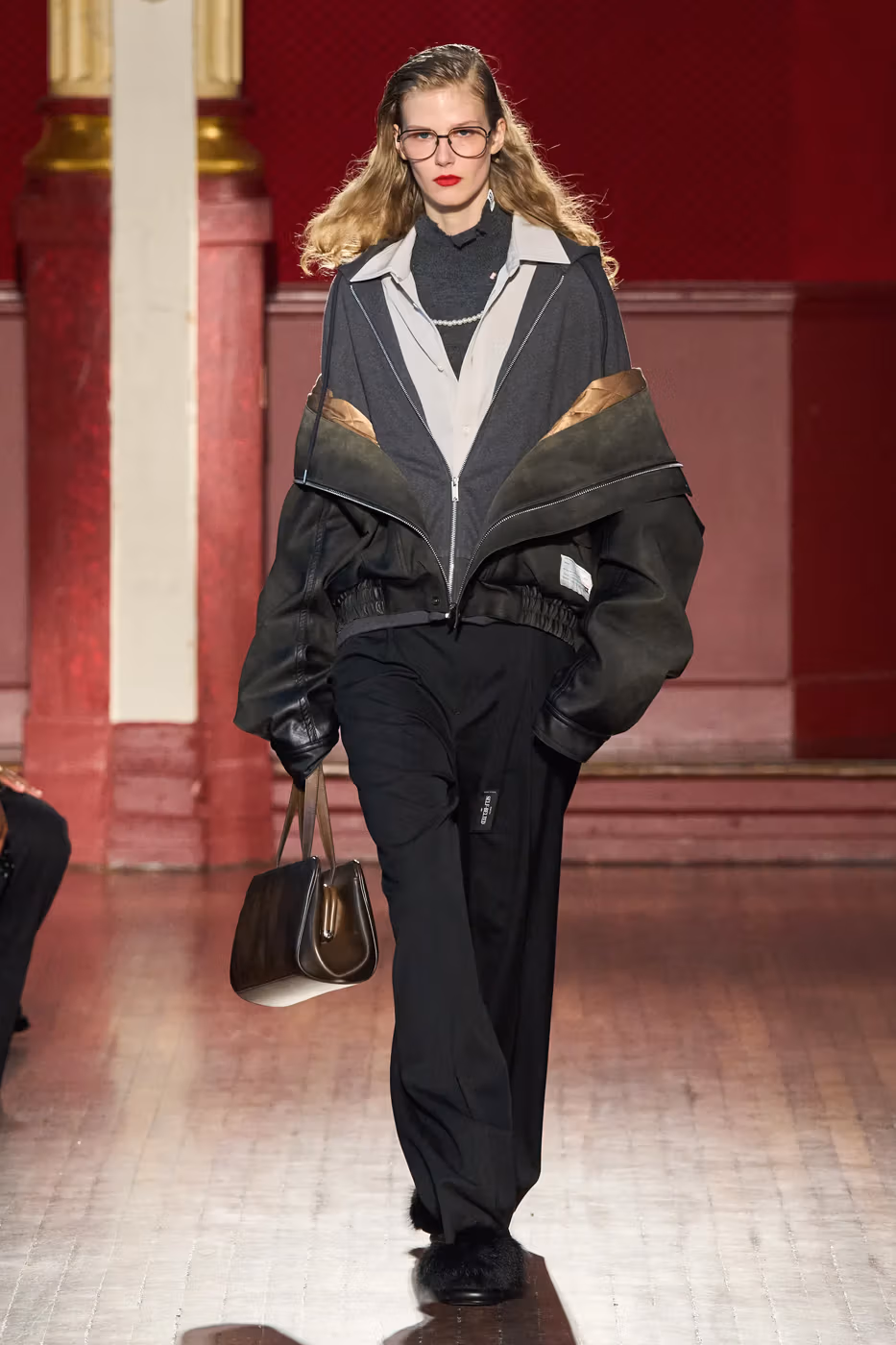 Cette narration se traduit visuellement par un jeu constant de désalignement et de dissonance. Les silhouettes semblent volontairement décalées, comme légèrement sorties de leur axe. Les manteaux oversize et les pièces d’outerwear imposantes dominent le vestiaire, tandis que les tricots reconstruits signature de la maison apparaissent familiers mais subtilement déformés. Les techniques d’assemblage, faites de greffes, d’erreurs structurelles assumées et de juxtapositions inattendues, créent une sensation de distorsion douce, à la frontière du réel et du surréel.