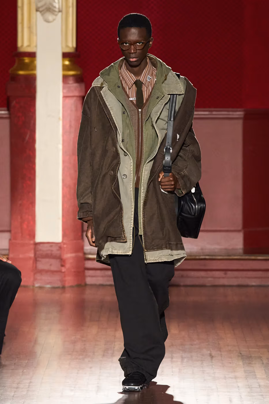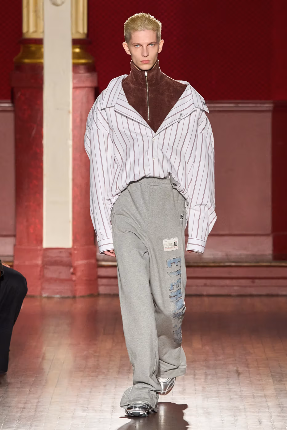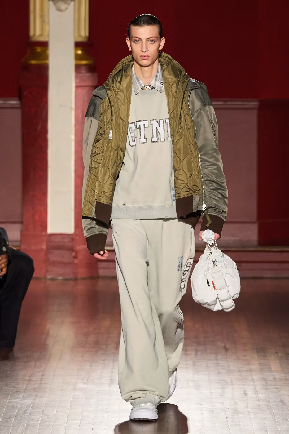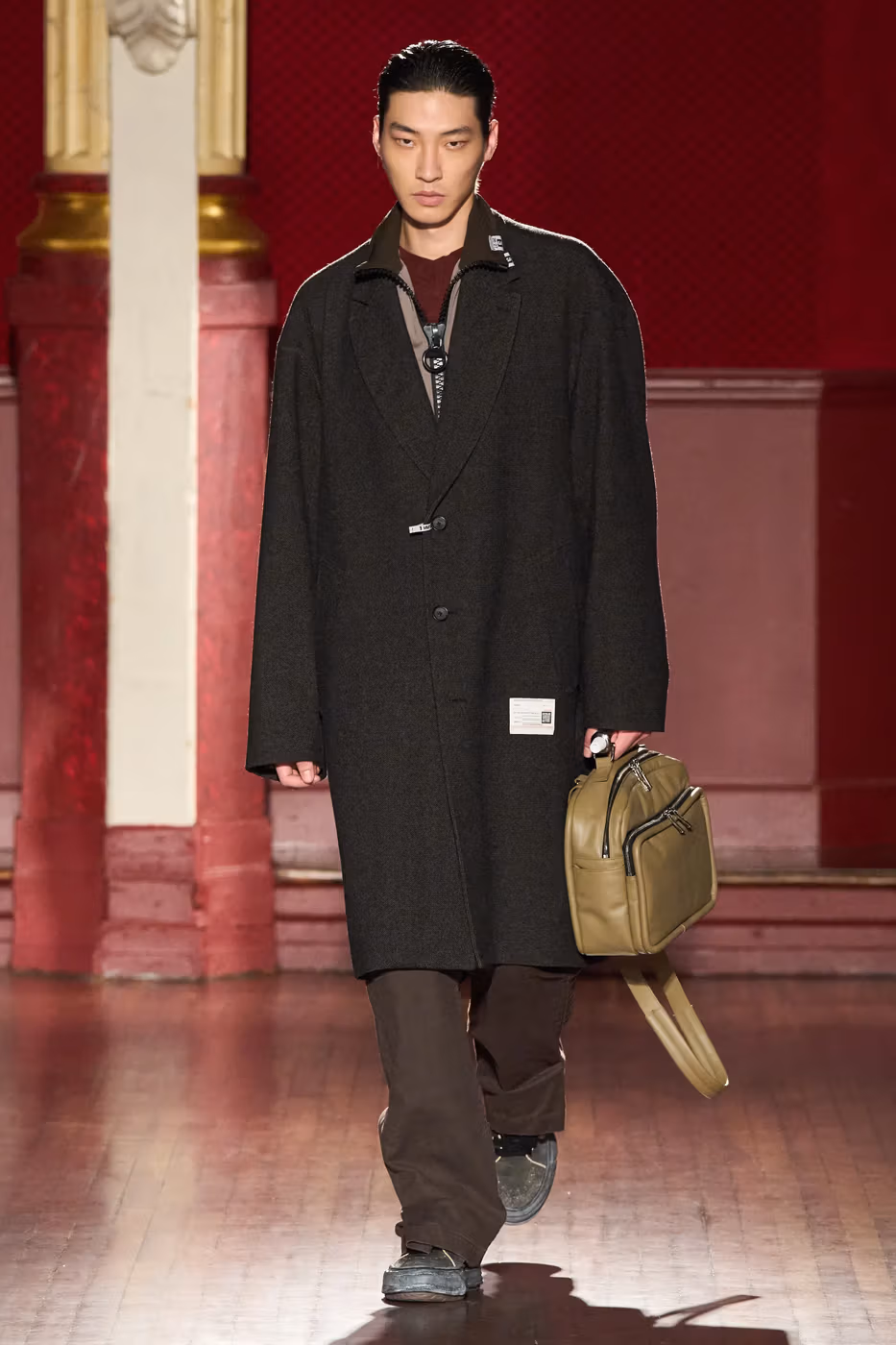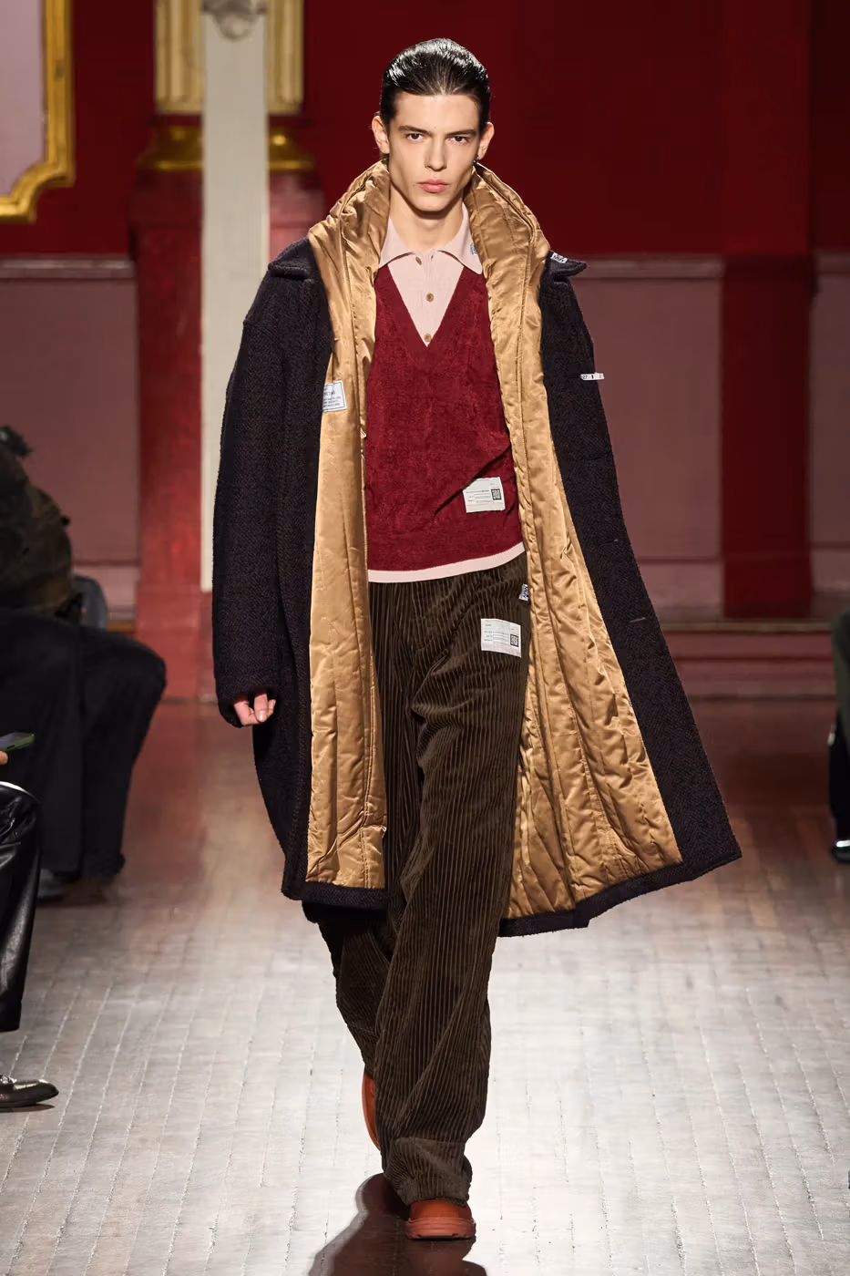 Cette narration se traduit visuellement par un jeu constant de désalignement et de dissonance. Les silhouettes semblent volontairement décalées, comme légèrement sorties de leur axe. Les manteaux oversize et les pièces d’outerwear imposantes dominent le vestiaire, tandis que les tricots reconstruits signature de la maison apparaissent familiers mais subtilement déformés. Les techniques d’assemblage, faites de greffes, d’erreurs structurelles assumées et de juxtapositions inattendues, créent une sensation de distorsion douce, à la frontière du réel et du surréel.