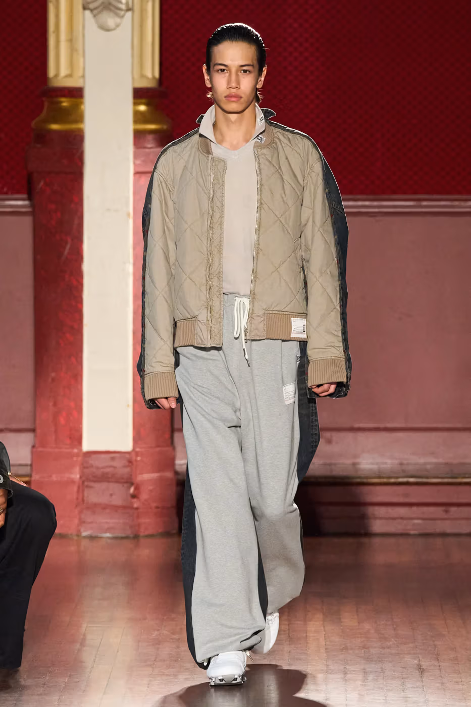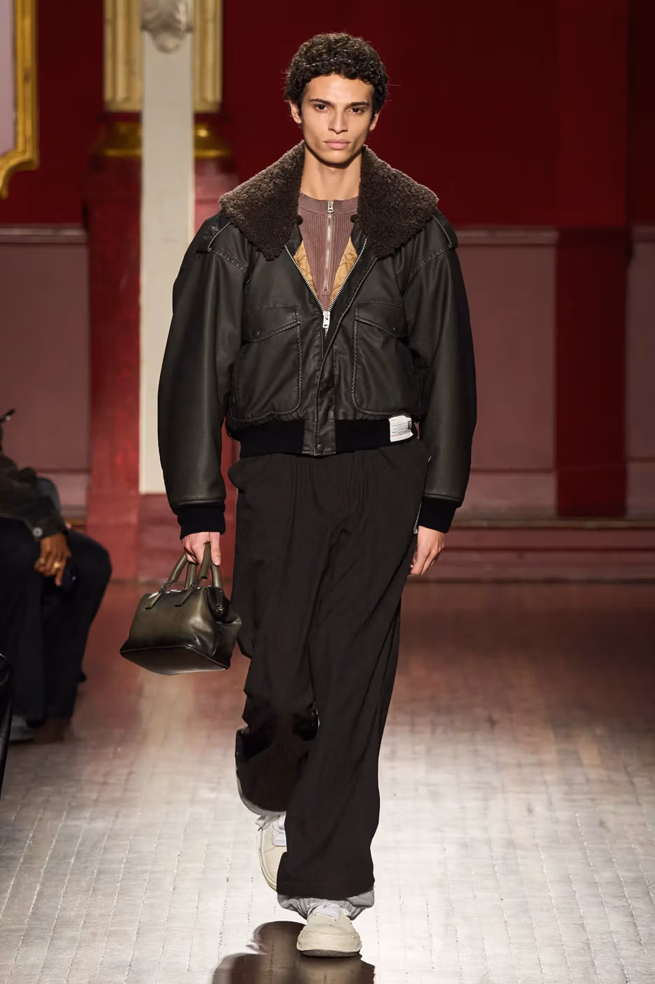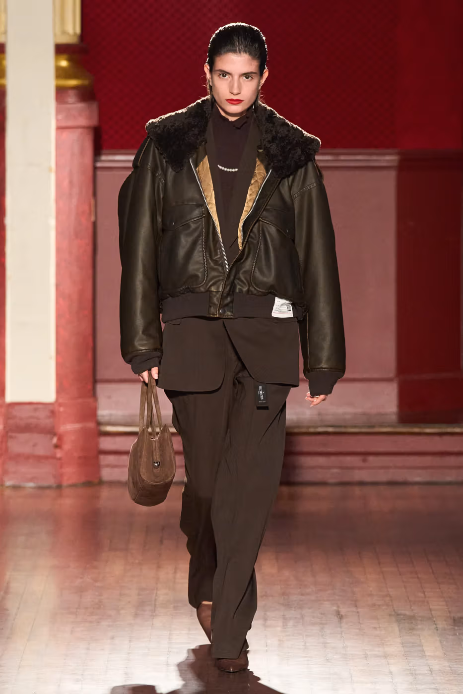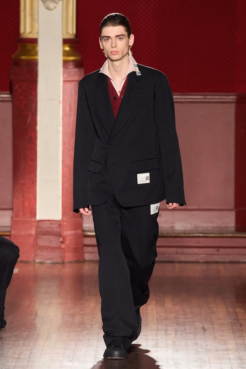 Cette narration se traduit visuellement par un jeu constant de désalignement et de dissonance. Les silhouettes semblent volontairement décalées, comme légèrement sorties de leur axe. Les manteaux oversize et les pièces d’outerwear imposantes dominent le vestiaire, tandis que les tricots reconstruits signature de la maison apparaissent familiers mais subtilement déformés. Les techniques d’assemblage, faites de greffes, d’erreurs structurelles assumées et de juxtapositions inattendues, créent une sensation de distorsion douce, à la frontière du réel et du surréel.