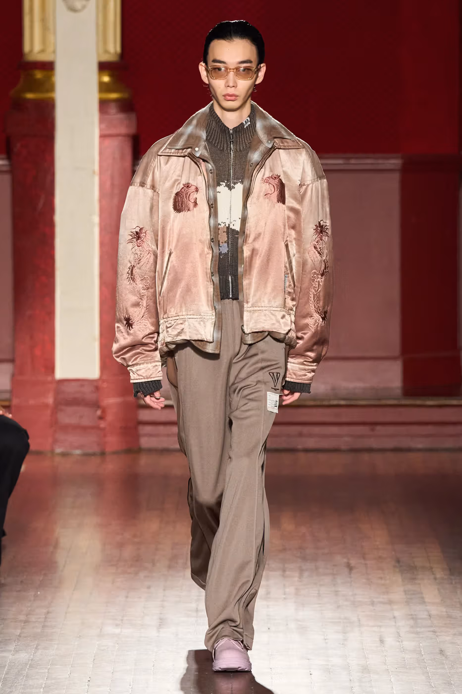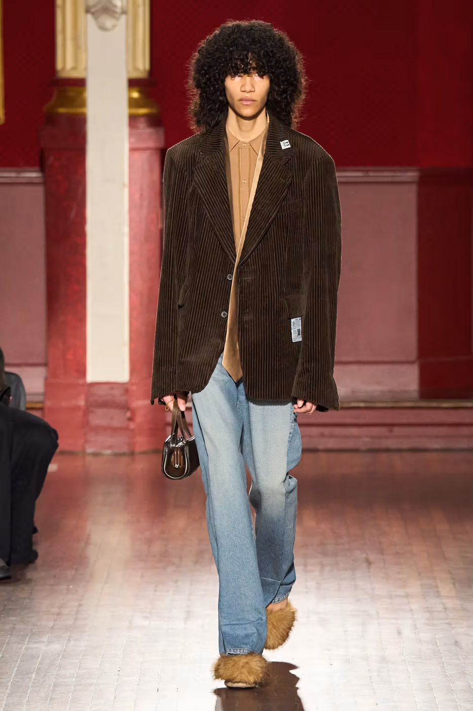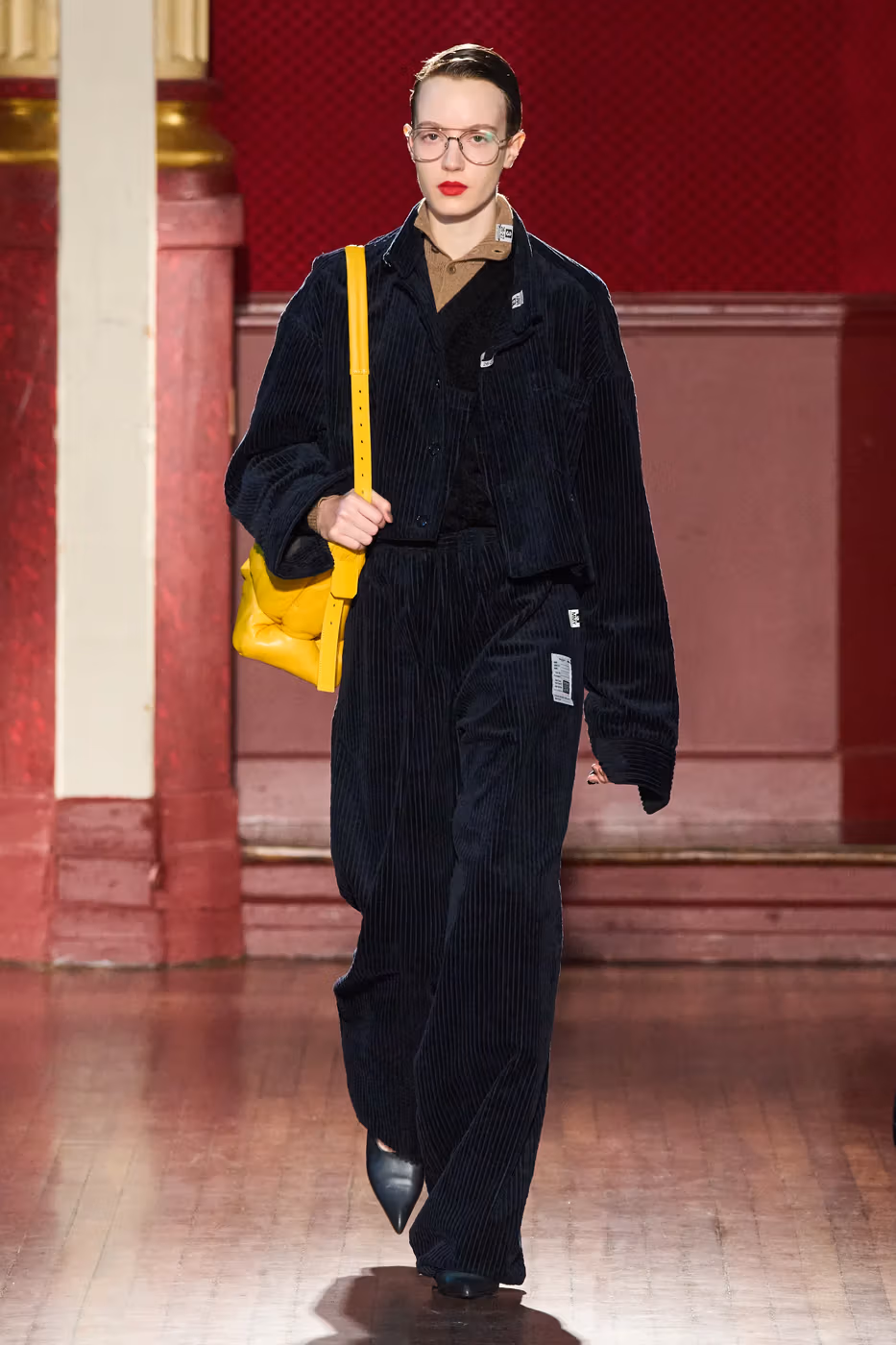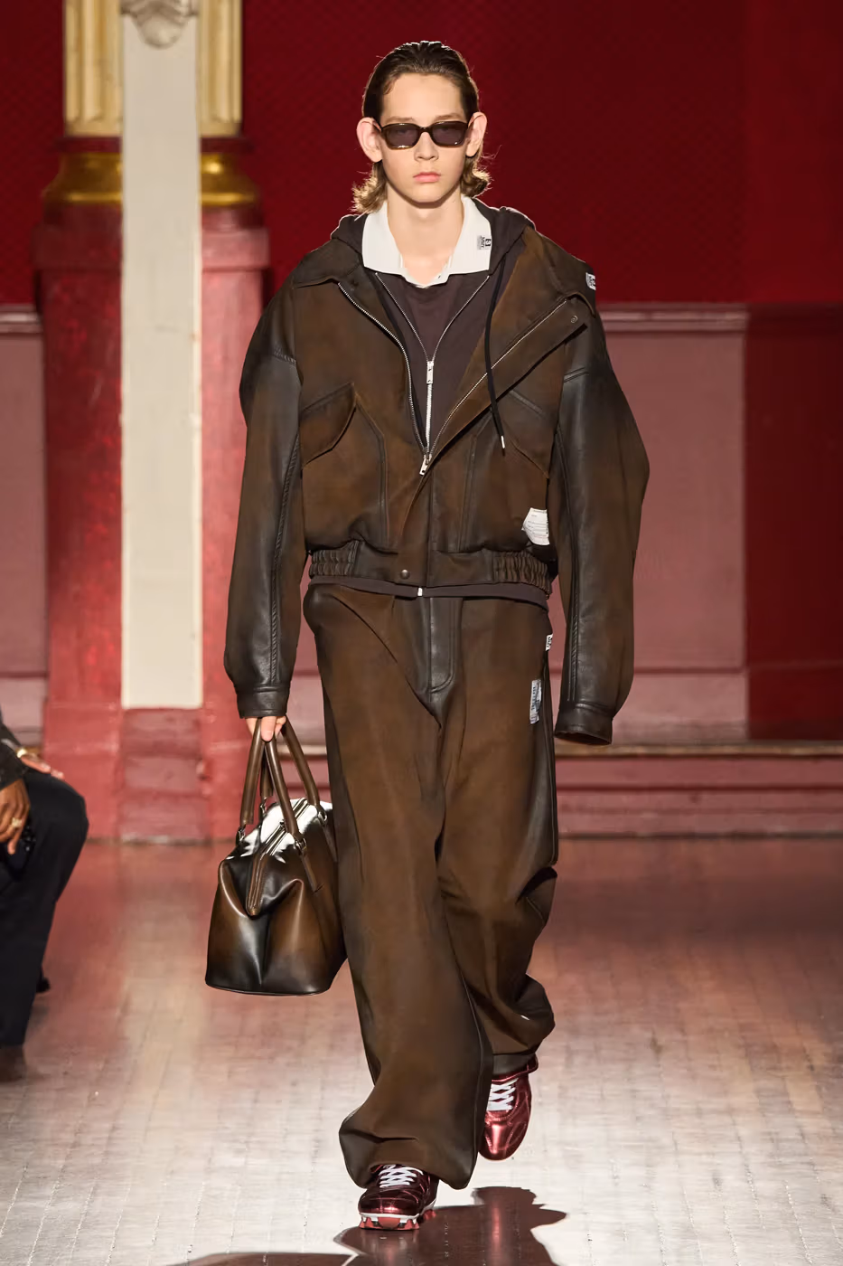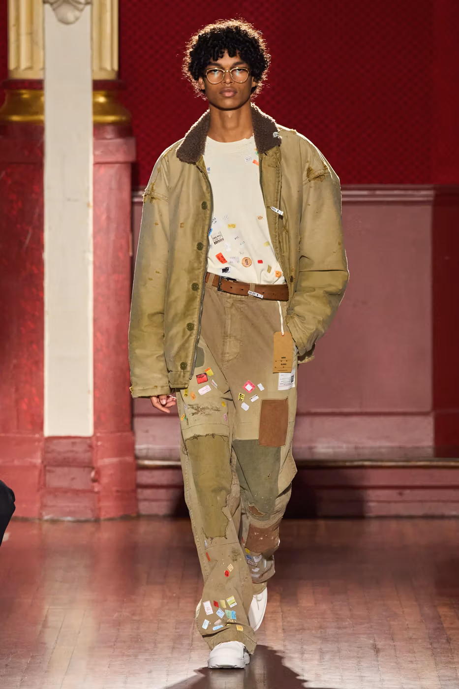 Cette narration se traduit visuellement par un jeu constant de désalignement et de dissonance. Les silhouettes semblent volontairement décalées, comme légèrement sorties de leur axe. Les manteaux oversize et les pièces d’outerwear imposantes dominent le vestiaire, tandis que les tricots reconstruits signature de la maison apparaissent familiers mais subtilement déformés. Les techniques d’assemblage, faites de greffes, d’erreurs structurelles assumées et de juxtapositions inattendues, créent une sensation de distorsion douce, à la frontière du réel et du surréel.