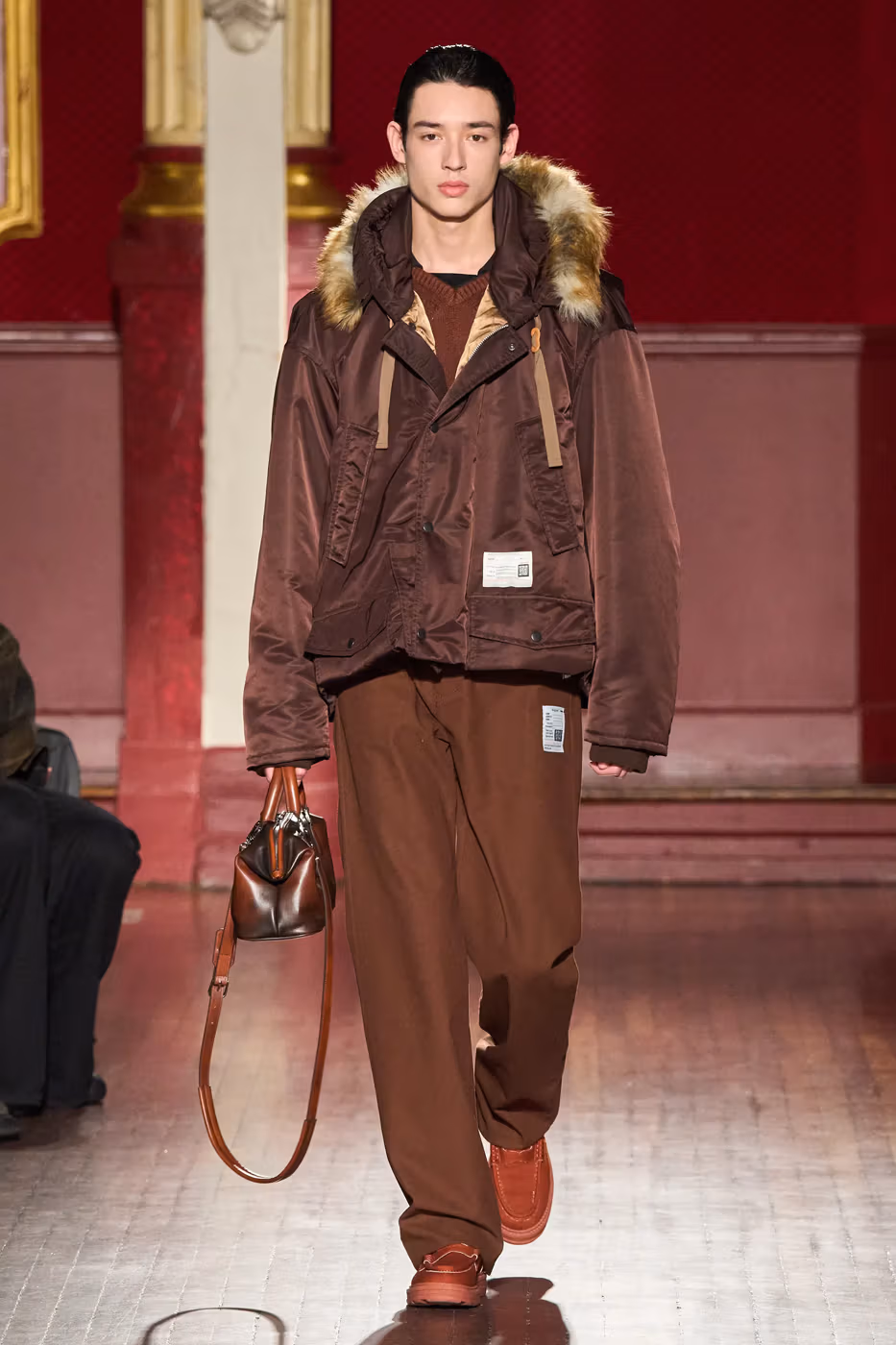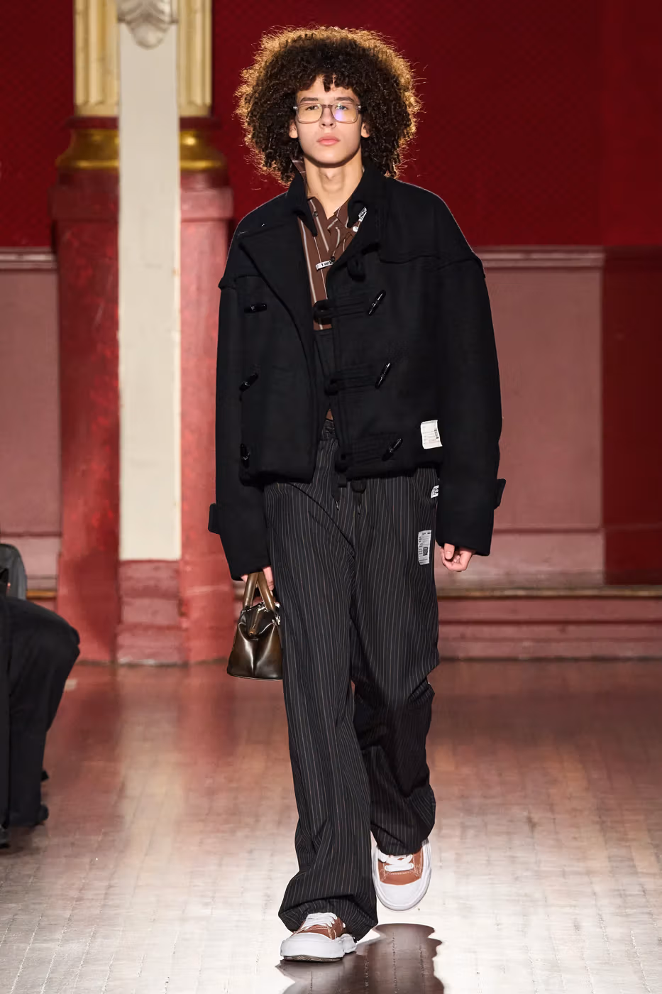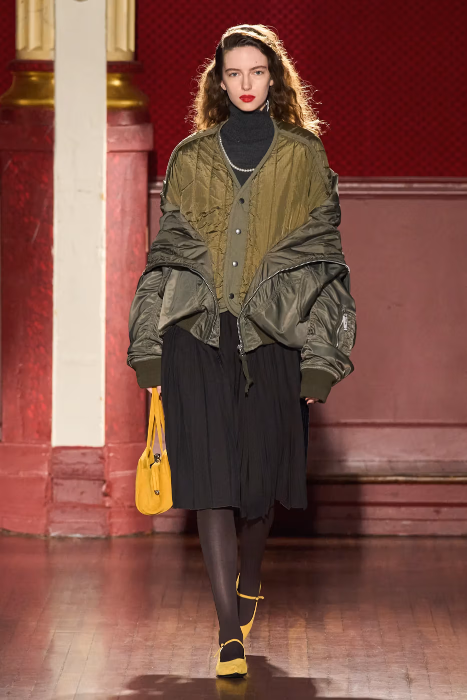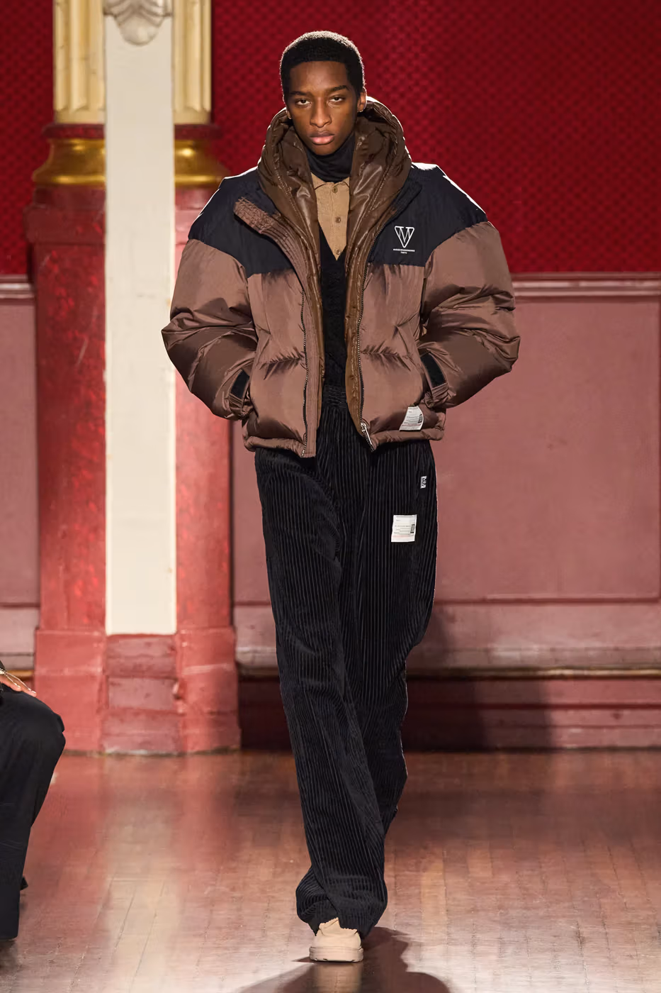 Cette narration se traduit visuellement par un jeu constant de désalignement et de dissonance. Les silhouettes semblent volontairement décalées, comme légèrement sorties de leur axe. Les manteaux oversize et les pièces d’outerwear imposantes dominent le vestiaire, tandis que les tricots reconstruits signature de la maison apparaissent familiers mais subtilement déformés. Les techniques d’assemblage, faites de greffes, d’erreurs structurelles assumées et de juxtapositions inattendues, créent une sensation de distorsion douce, à la frontière du réel et du surréel.