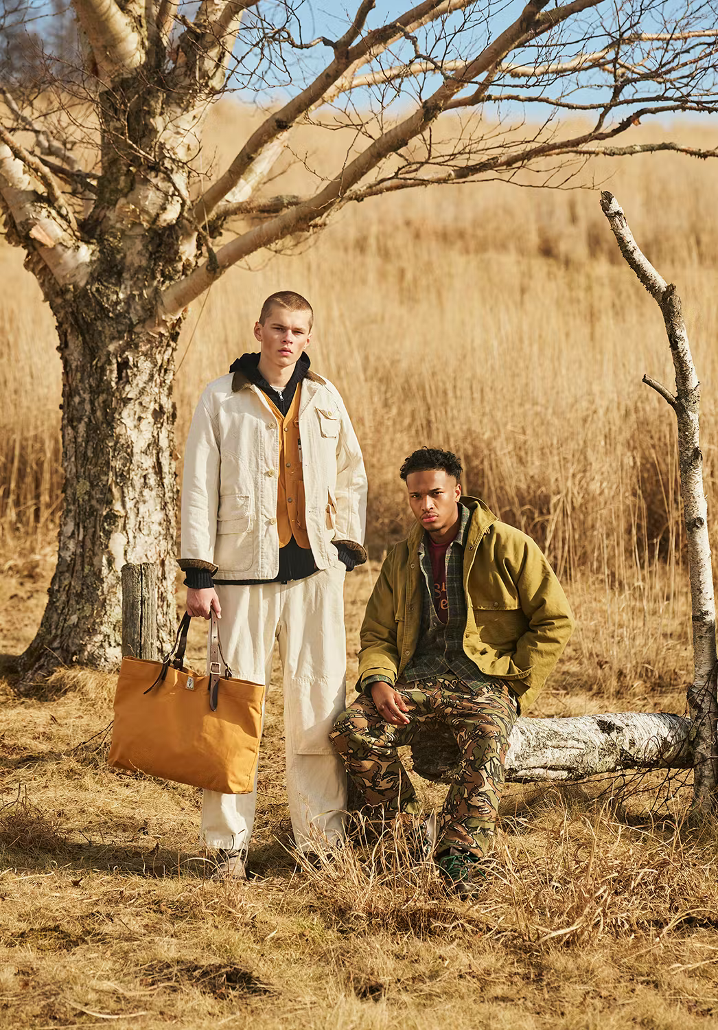 À l’image de survêtements en velours et de sweats volontairement délavés, présents dans la campagne visuelle — un contraste assumé pour une marque historiquement associée aux vestes de chasse et aux vêtements utilitaires. Les pièces techniques, telles que les doudounes isolantes et les couches intermédiaires matelassées, assurent néanmoins une continuité logique avec l’ADN outdoor du label.