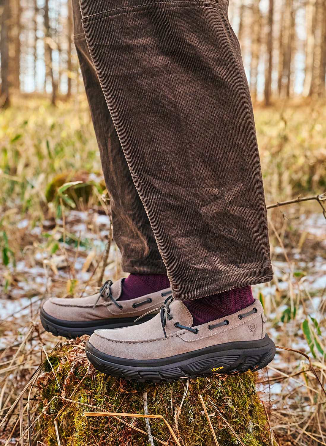 Cette montée en puissance se reflète dans une collection FW26 particulièrement dense. On y retrouve une profusion de vestes et gilets à poches cargo, une quantité impressionnante de chemises en coton brossé, des pantalons à ceinture intégrée pensés pour l’escalade ou la randonnée, ainsi qu’une proposition de chaussures originales, vraisemblablement développées en interne. Un tournant notable, quand on sait que les précédentes incursions footwear de la marque reposaient sur des partenariats avec Suicoke ou On.