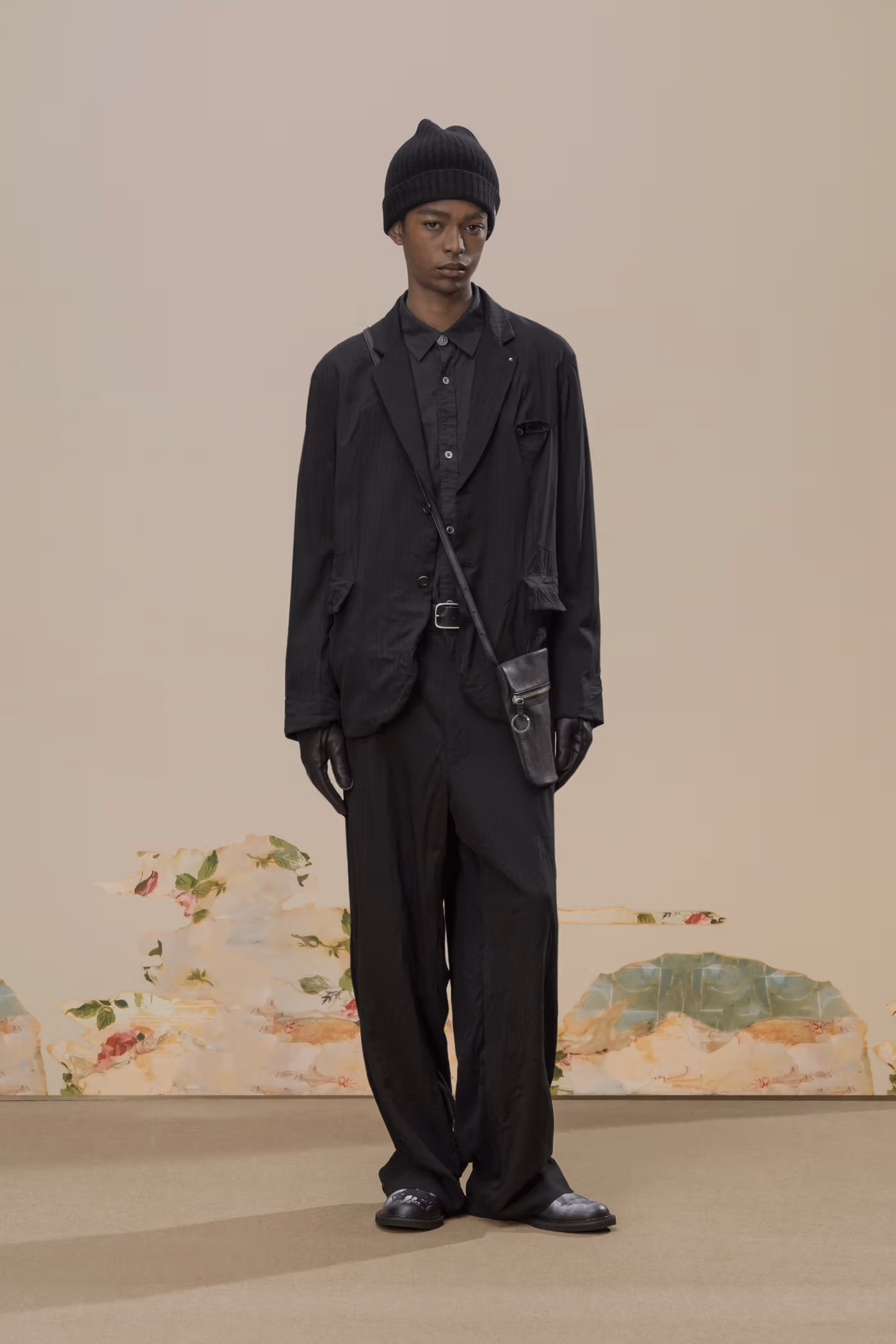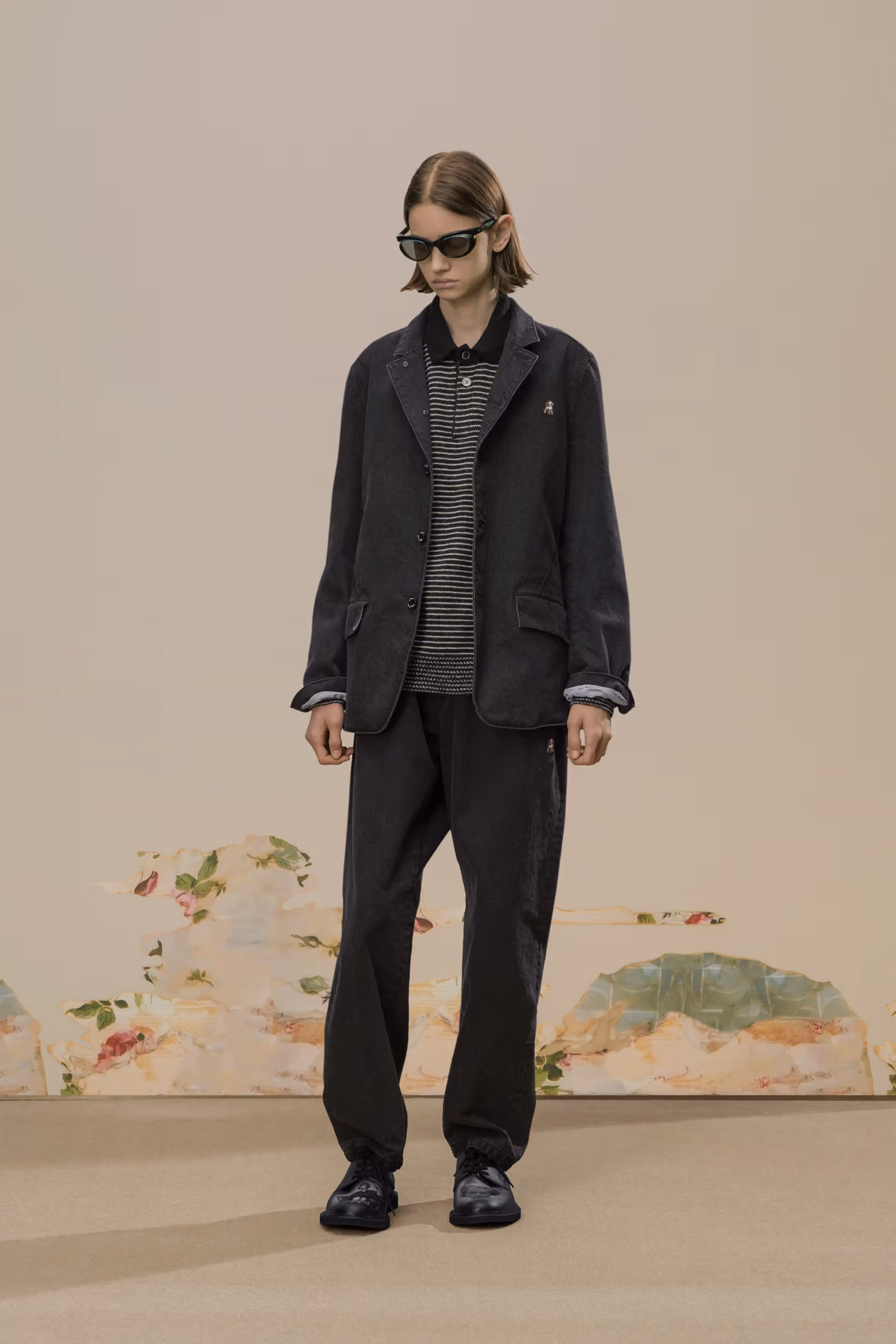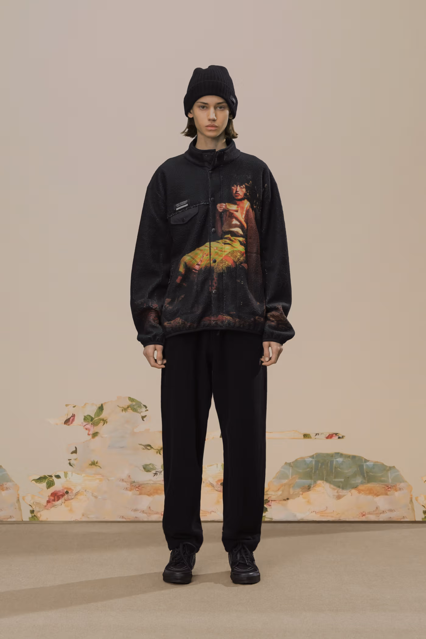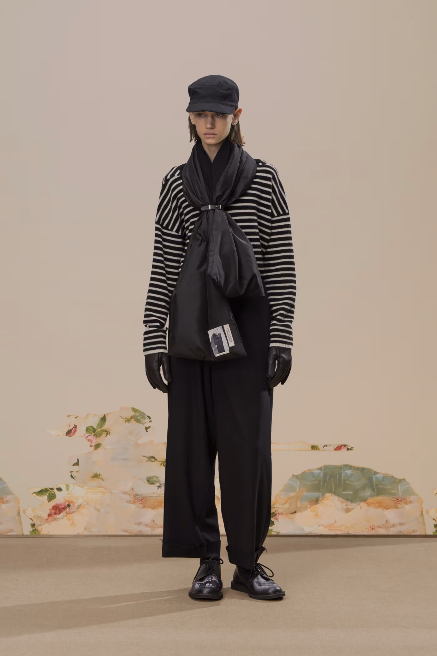 Déjà exploré lors de la saison Spring/Summer 2020, l’univers visuel de Cindy Sherman réapparaît ici comme pilier conceptuel de la collection. Ses images cinématographiques, volontairement troublantes, sont intégrées sous forme de prints et de patchs, renforçant une atmosphère à la fois inquiétante et précieuse. Là où la collaboration précédente s’appuyait sur un tailoring sombre, cette nouvelle itération pousse plus loin l’exigence matérielle grâce à l’utilisation de textiles japonais et italiens haut de gamme, accentuant une opulence feutrée.