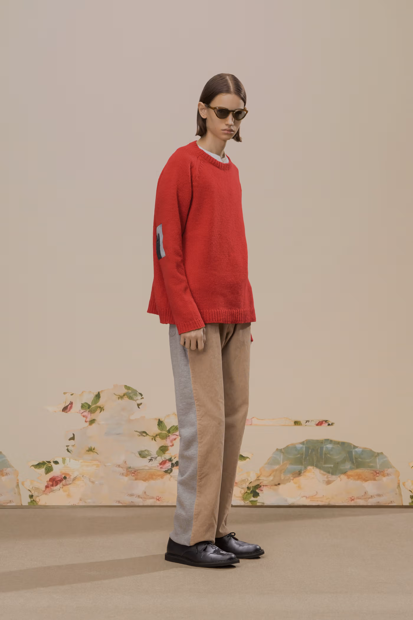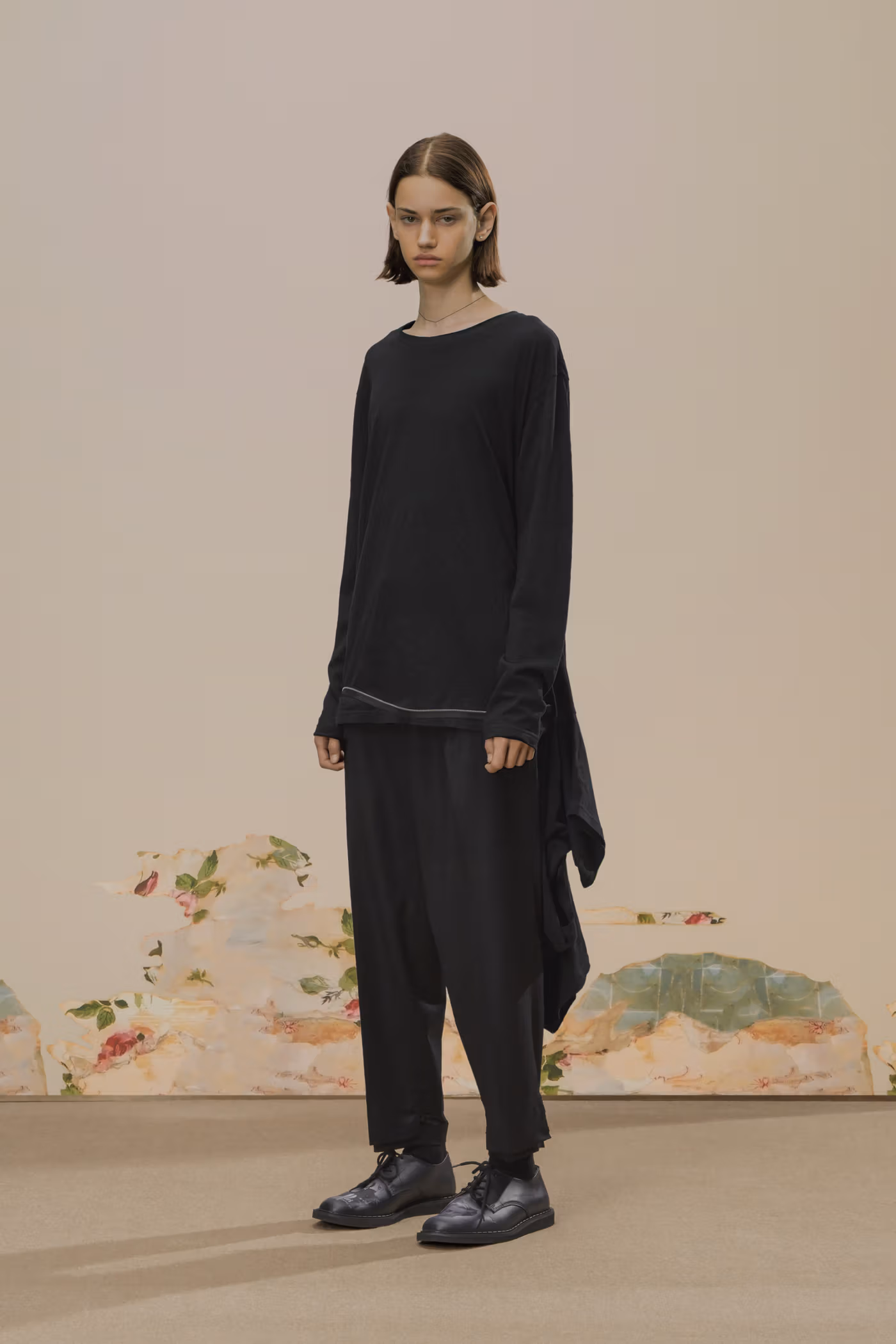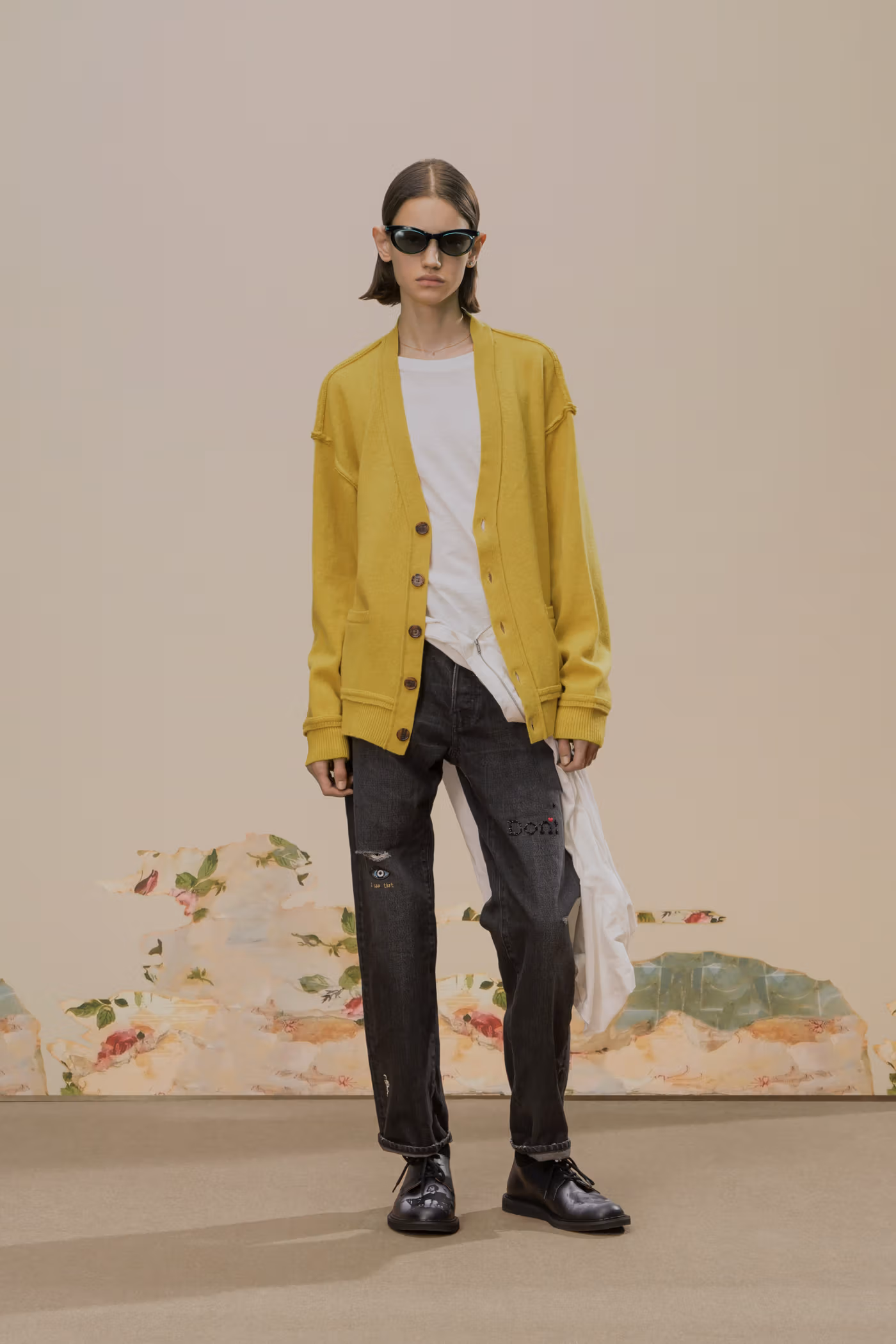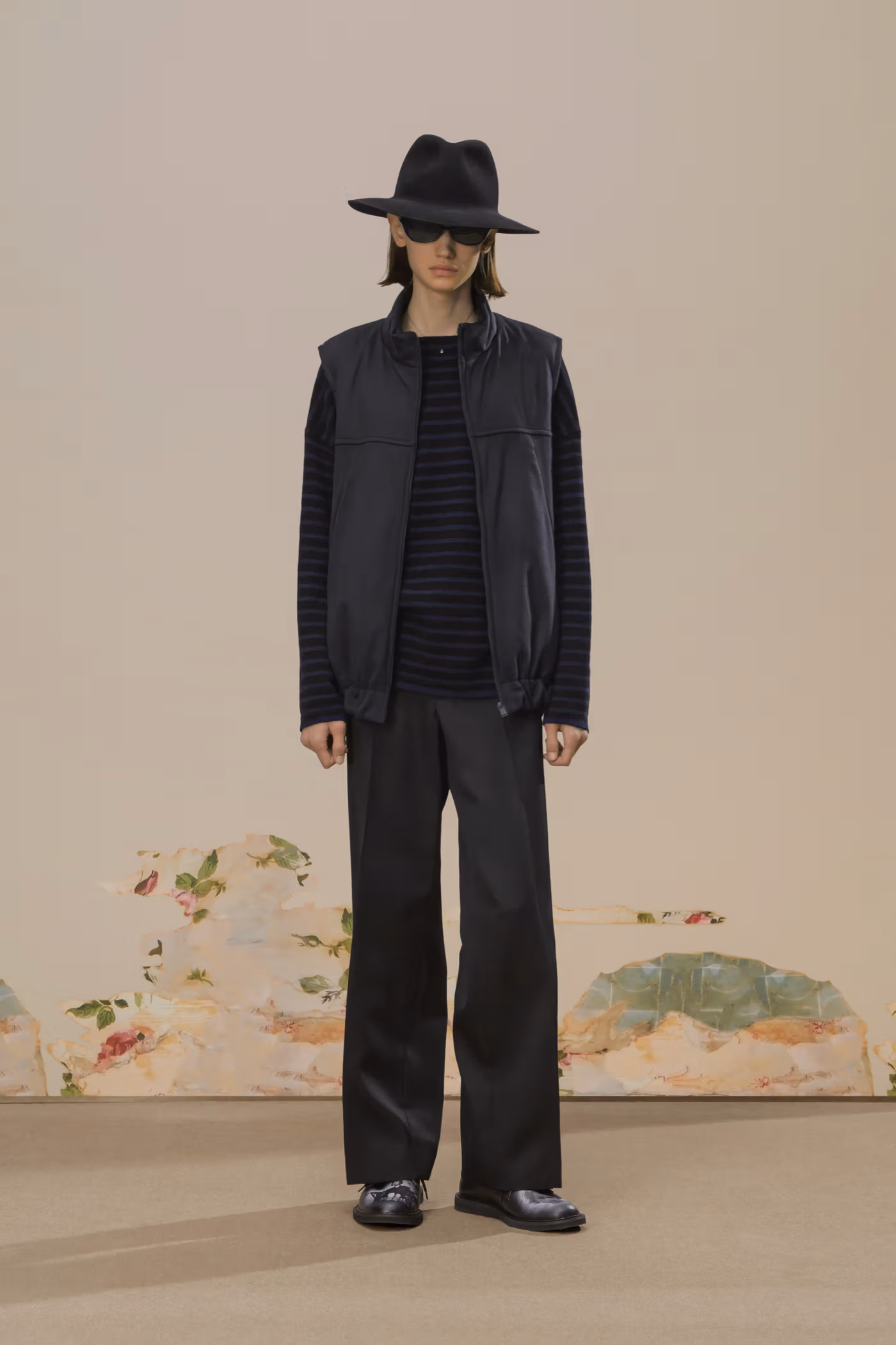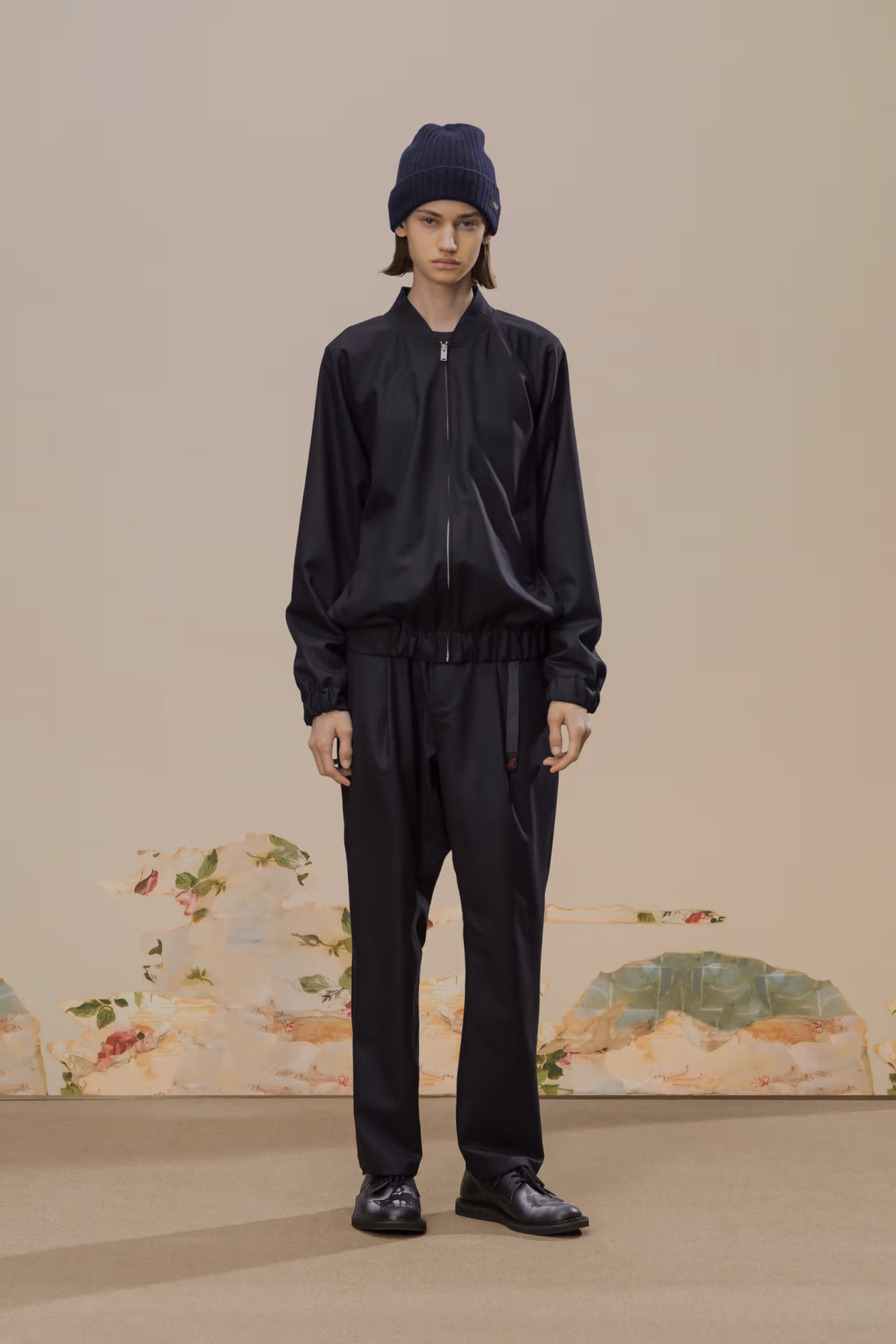 Déjà exploré lors de la saison Spring/Summer 2020, l’univers visuel de Cindy Sherman réapparaît ici comme pilier conceptuel de la collection. Ses images cinématographiques, volontairement troublantes, sont intégrées sous forme de prints et de patchs, renforçant une atmosphère à la fois inquiétante et précieuse. Là où la collaboration précédente s’appuyait sur un tailoring sombre, cette nouvelle itération pousse plus loin l’exigence matérielle grâce à l’utilisation de textiles japonais et italiens haut de gamme, accentuant une opulence feutrée.