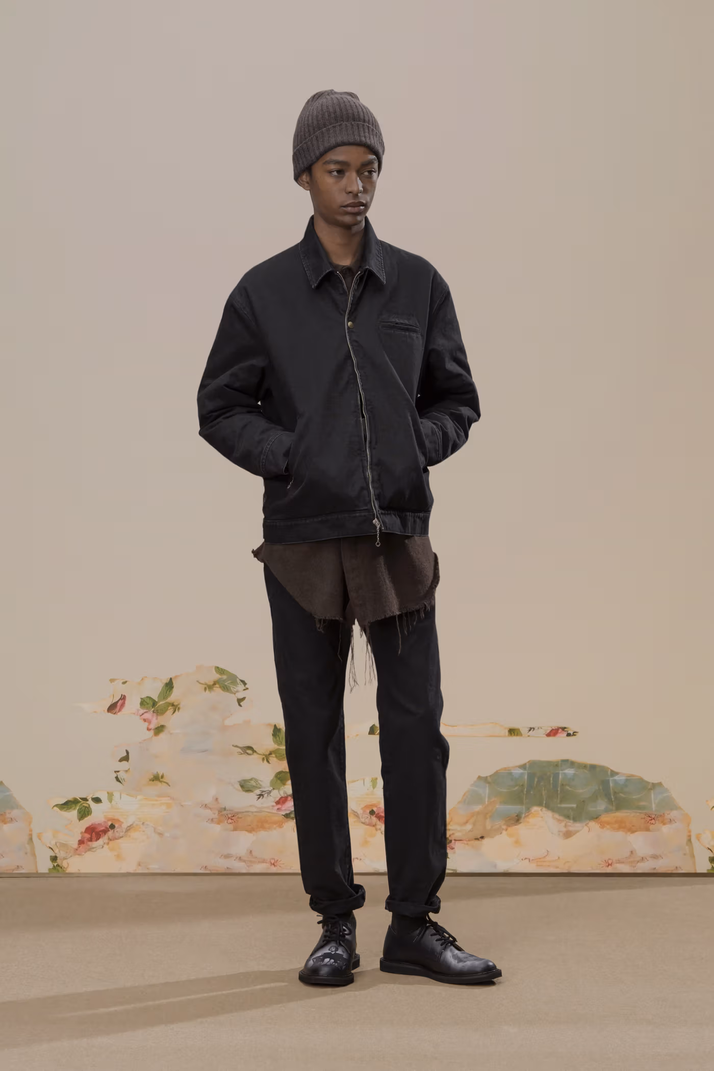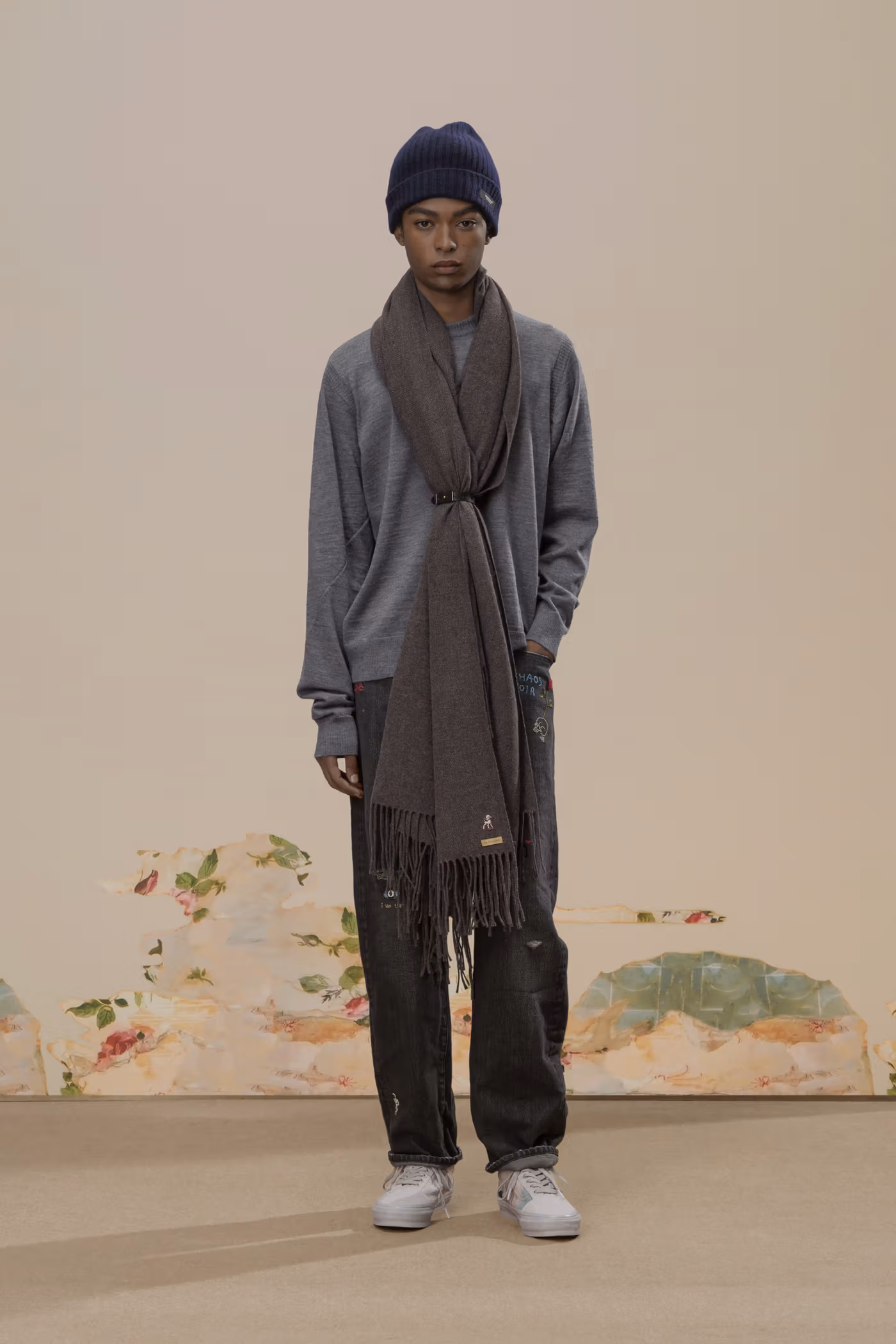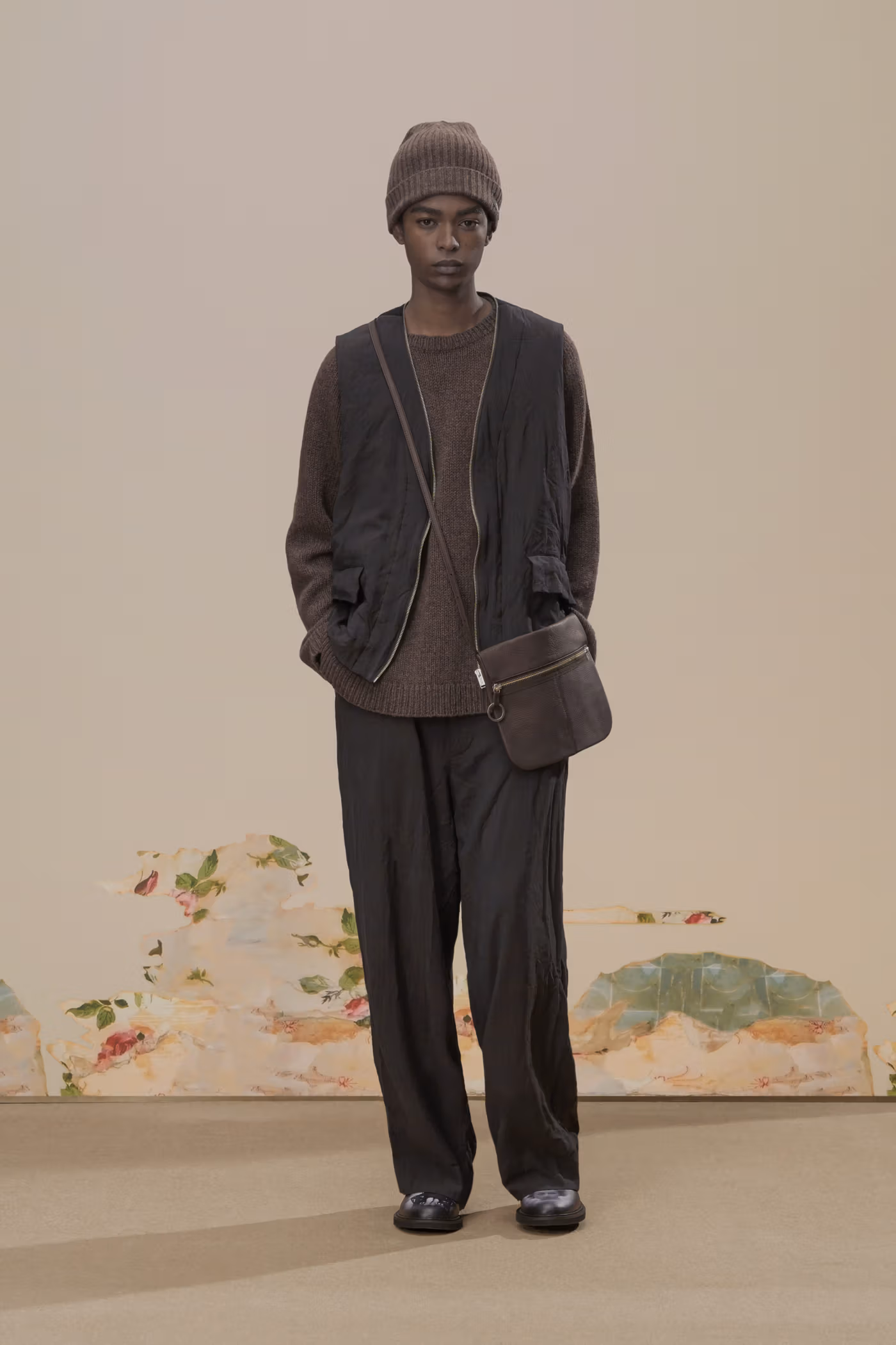 La palette chromatique reste volontairement disciplinée. Le noir profond et le charbon dominent, ponctués de rares écarts : jacquards botaniques brun foncé ou jeux de carreaux discrets dans certaines mailles. Cette retenue renforce la cohérence globale et laisse toute la place à la texture et à la construction.