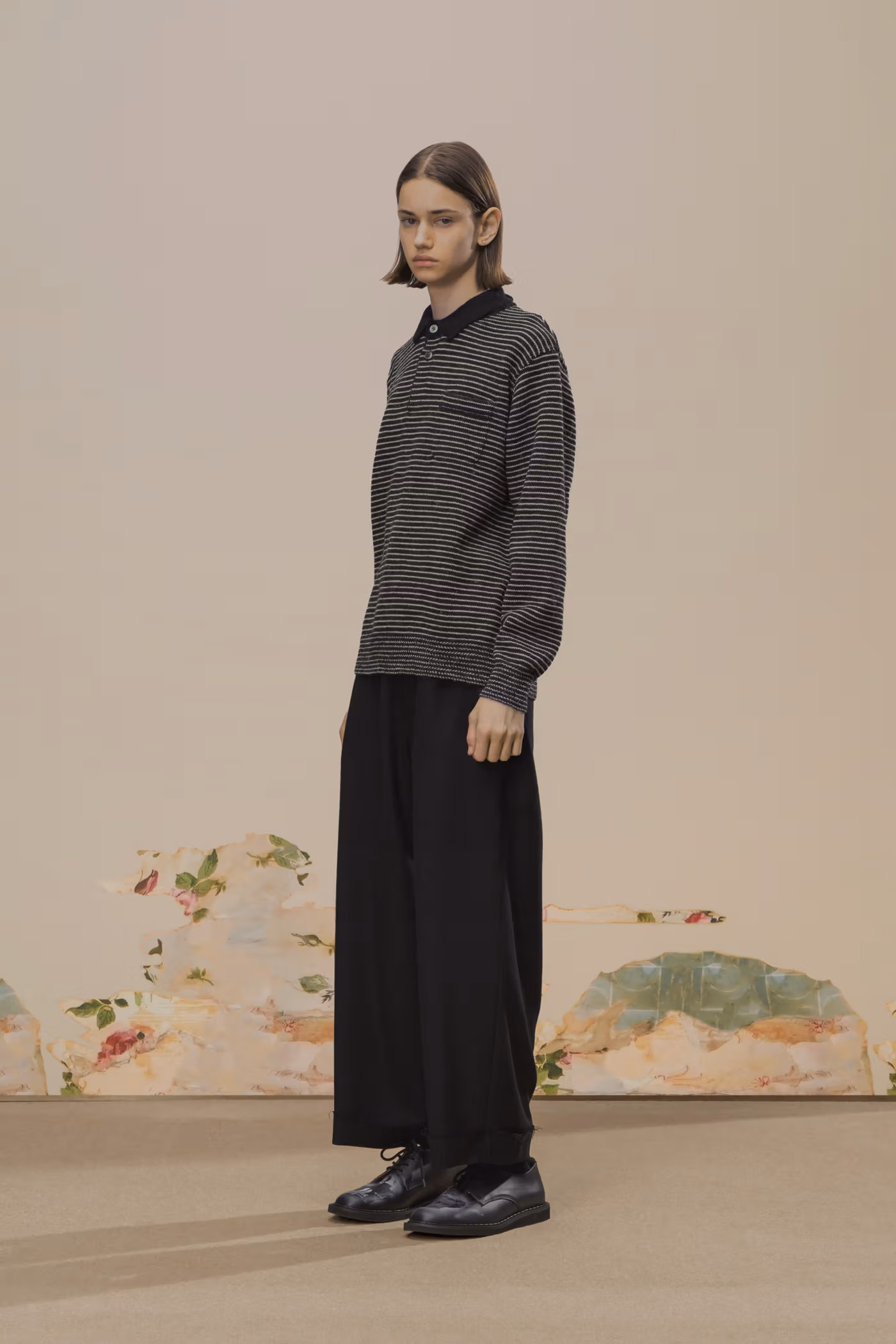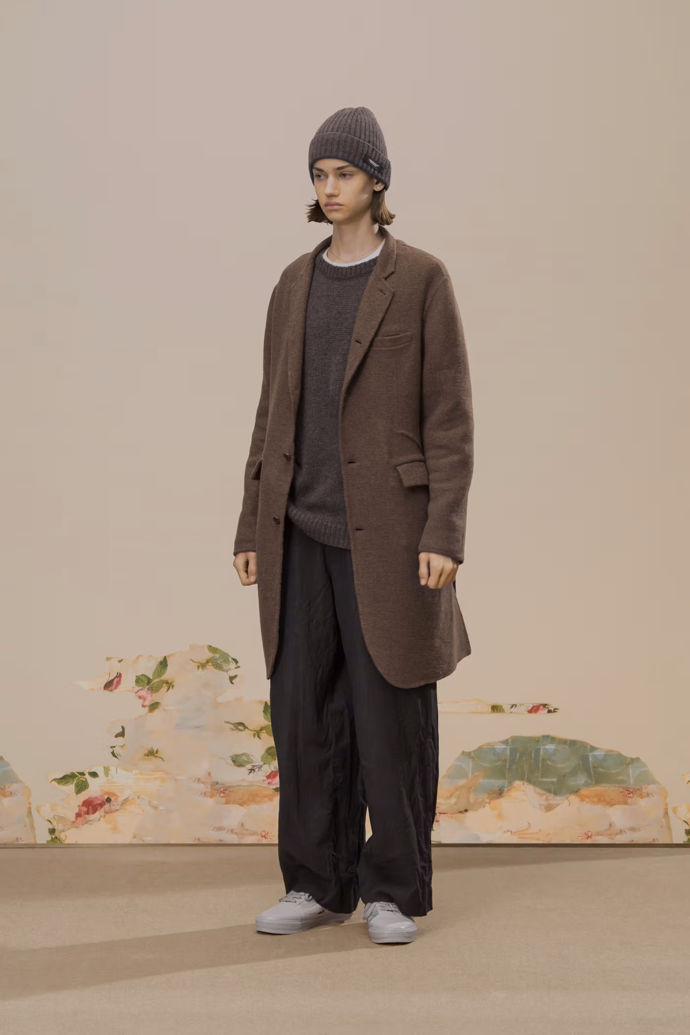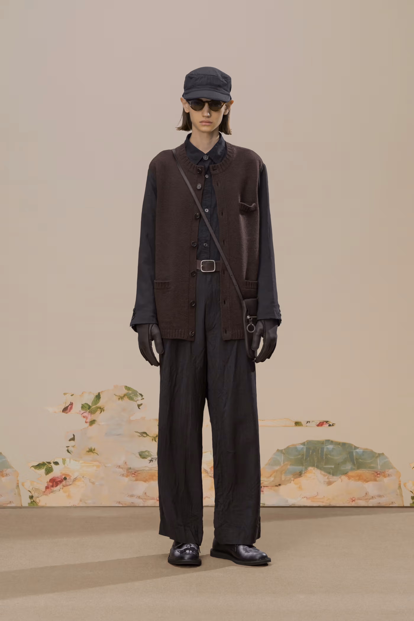 La palette chromatique reste volontairement disciplinée. Le noir profond et le charbon dominent, ponctués de rares écarts : jacquards botaniques brun foncé ou jeux de carreaux discrets dans certaines mailles. Cette retenue renforce la cohérence globale et laisse toute la place à la texture et à la construction.