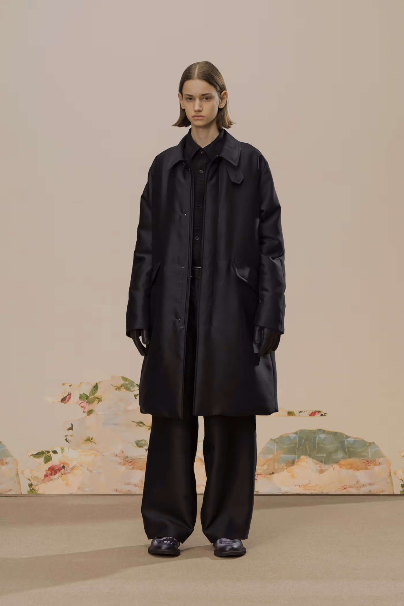 La collection se structure autour de pièces d’outerwear sophistiquées : manteaux droits matelassés de soie, car coats épurés et flight jackets réinterprétées dans une logique de luxe fonctionnel. Le cuir noir, omniprésent, s’impose comme élément central, conférant à l’ensemble une puissance visuelle immédiatement identifiable.